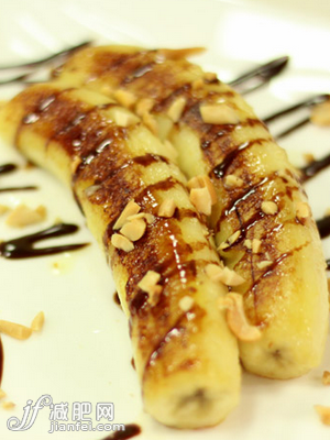 7、煎好的香蕉放入盘中,挤上巧克力酱,再撒上一些熟花生碎。