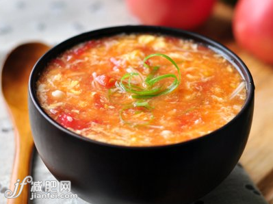 做法:清水、姜片煮滚,加入番茄片翻滚,再加入搅匀的蛋液即成。