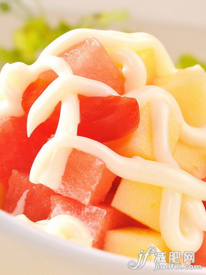 1、哈密瓜、西瓜、苹果、菠萝、香蕉切丁入盘;把蜂蜜和蛋黄酱搅拌后倒入盘中。