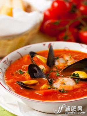 大的番茄2颗,烫后去皮,打成汁。准备好带壳虾子2只、花枝2片、蛤蜊5颗、鲷鱼片2片、九层塔适量、柠檬1/4颗、洋葱半颗切成细末、海盐1小茶匙、水3碗。