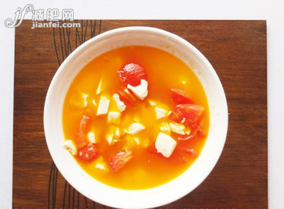 1、豆腐切小块;西红柿洗净,顶部划十字刀口,放在热水中浸泡一会后撕掉外皮。然后切成跟豆腐大小相同的块;豌豆入沸水中煮熟,然后过凉水沥干;