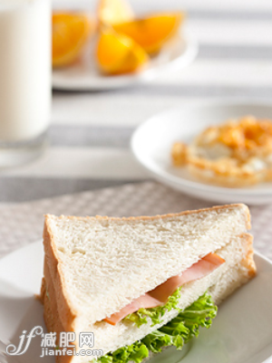 用不粘锅的话煎蛋就无须放食用油,再取两片全麦切片面包,还可以按自己的口味加火腿,生菜和脱脂色拉酱即可;用时令水果调配不同的果汁,鲜橙胡萝卜汁,甜瓜苹果汁,纯猕猴桃汁,纯黄瓜汁都会是很好的选择。