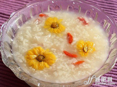 2.锅内倒入清水、玉米须,煮10分钟后滤去玉米须,加入大米煮至粥成,再放入盐、菊花、玉米须,略滚即成。