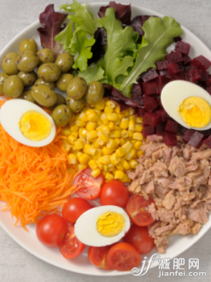*鲑鱼或鲔鱼罐头一罐加在油醋沙拉上。