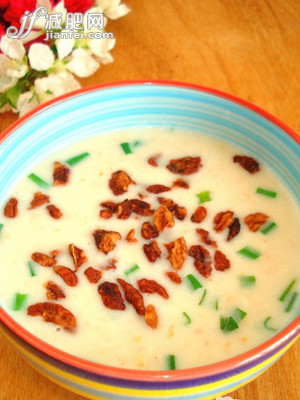 牛奶蛋羹:脱脂牛奶100克,鸡蛋1个。加盐、香油、葱花各少量,混合蒸熟。