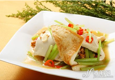 功效:豆腐因为高营养、高矿物质、低脂肪而深受减肥者的亲睐。豆腐中丰富的蛋白质含量让人有很强的饱腹感,更能提高新陈代谢功能。芹菜有着淡淡的清香味道,能够消肿解毒,降低血压。它的膳食纤维和水分都非常丰富,能够有效的解决我们的便秘问题,预防毒素堆积。而且芹菜中还含有大量的维生素A、维生素C、胡萝卜素以及各种微量元素,可以有效的提高人体的新陈代谢,起到减肥的作用。