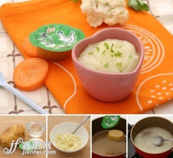 1,土豆泥倒入小煮锅中,盛少许水,加入半块家乐清鸡靓汤口味浓汤宝,一边搅拌、一边以小火慢慢加热。