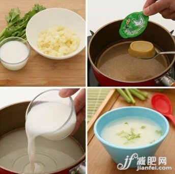 原料:原味土豆泥1碗(做法见上),水适量,淡奶油2~3勺,家乐清鸡靓汤口味浓汤宝半块,香芹1小根