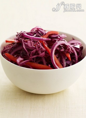 中国减肥网小编点评:紫甘蓝中含有大量的纤维素,可以帮助肠蠕动,加速身体代谢。洋葱是减肥食谱里常用的原料之一,其中含有的辣椒素活性因子能够促进脂肪燃烧,并抑制肠道对餐后食物中脂肪的吸收。也能起到通便的作用,有效防止脂肪的二次堆积。