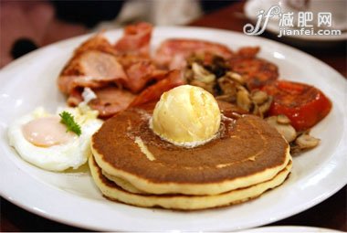 推荐早餐减肥食谱:番茄培根土豆饼+豆浆+香蕉+红枣+杏仁