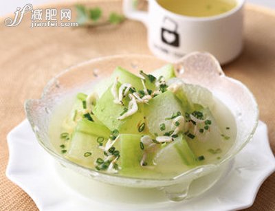 此食疗清热生津,降脂利湿。冬瓜富含维生素C、维生素B1以及多种微量元素,有助于清理肠胃,利尿消肿。