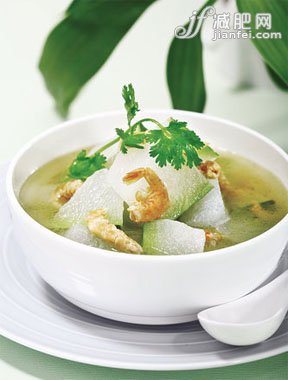 新鲜连皮冬瓜80克—100克(或冬瓜仁,干的10克—15克、新鲜的30克),粳米100克为原料。将冬瓜用刀刮后洗净,切成小块,再同粳米一起置于 砂锅内,一并煮成粥即可(粥内不要放盐)。或是先用冬瓜仁煎水去渣,再净粳米放粥煮,每天早晚两次时,常食有效。可以利尿消肿,减肥降脂。
