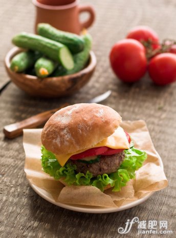汉堡一个、华盛顿富士苹果1/2颗、冷冻汉堡肉一片(二两),莴苣菜一片(10公克)。