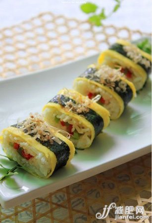小编点评:鸡蛋所富含的蛋白质让节食减肥的姑娘们好好的补充补充,这款寿司中搭配了青红椒,虽然不会很辣但是不妨碍它辣椒素的挥发,同样能够帮助你加快血液循环,促进新陈代谢,快速燃脂哦!