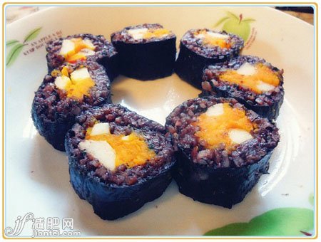 小编点评:紫米用来做寿司是不是很新奇啊!紫米的深紫色搭配南瓜的金黄色,在颜色上相当的出挑哦。而南瓜能够帮助排便的功能是众所周知的了,这款寿司能够帮你快速的抚平突起的小肚腩哦!