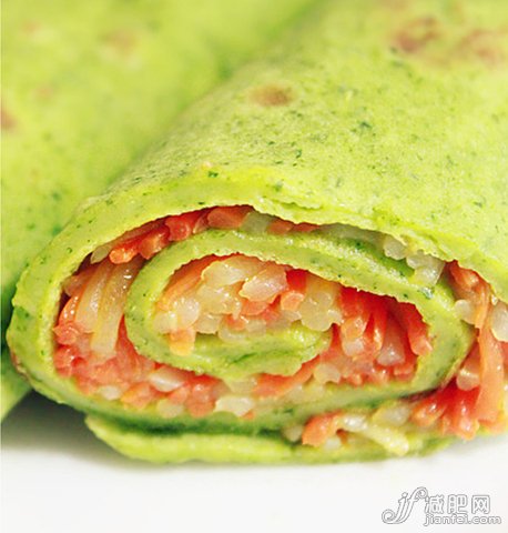 3、最后将炒好的土豆胡萝卜丝铺在菠菜饼上,卷好即可。