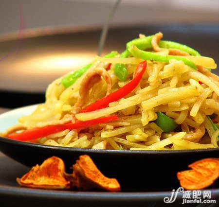5.不要放水,一直中火炒土豆丝,快熟时加入青红椒丝翻炒片刻,出锅关火前加入肉丝、鸡精拌匀,撒上葱花即可。