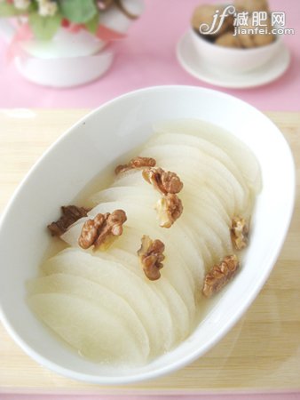 核桃中含有十分丰富的营养素,搭配雪梨对于清肺排毒非常有帮助,如果能够适当的加入少许的姜丝,那么更可以畅通气血,促进脂肪的代谢,达到瘦身的效果。