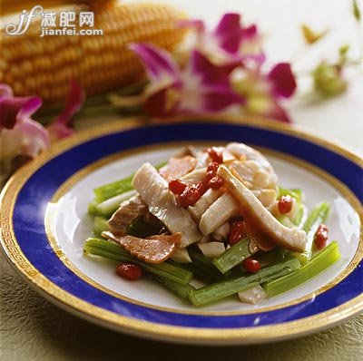 原料:芹菜杆100克,嫩长豇豆150克,生姜丝10克。花生油、川盐、野山珍鸡精各适量。