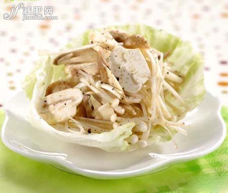 材料:色拉用蔬菜(洋生菜,菊苣,红色卷心菜)1杯,鸡胸脯肉150g,清酒1大匙,精盐少许,酱油调味汁。