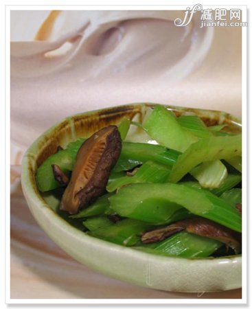 芹菜有特别的香味,香菇的味道可以让芹菜的味道相对来说清淡一些。芹菜是减肥时候的必备,因为吃了会很饱,但是热量又特别低。一根1尺来长的芹菜茎只有10卡路里。芹菜是负卡路里食物(其它还有黄瓜,芦笋等),意思是指身体需要燃烧更多热量来消化。