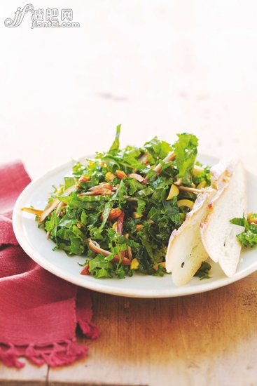 配料:新鲜柠檬汁适量、橄榄油适量、新鲜甘蓝1株、去核枣适量、杏仁适量、去核青橄榄适量