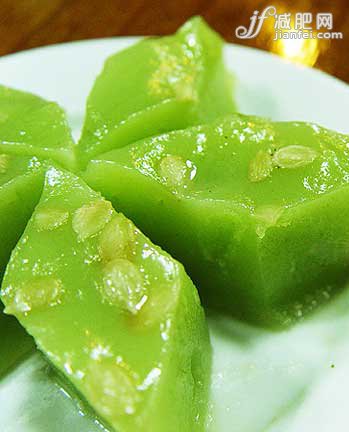 取绿豆500克煮至烂熟,加入切碎的薄荷叶15克、白糖25克和少许桂花做成馅备用,再把糯米500克焖熟,晾凉。然后用糯米饭包馅,用木槌压扁即成。