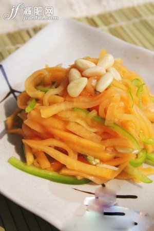 木瓜的减肥丰胸功效非常强大,所以很多人喜欢用木瓜来制作各种美味低脂的沙拉。今天要介绍的这道瘦身沙拉十分简便,我们只需要准备一个木瓜、少量的蜂蜜和柠檬汁以及一些枸杞就可以了。首先把木瓜去皮,然后切成细细的丝状,接着把它们浸入柠檬水中停留几分钟,柠檬也是一种消减脂肪的圣品,接着再加入一些蜂蜜搅拌调味,最后把枸杞放进去就可以了。这样,酸酸甜甜的木瓜沙拉就做好了,而且对排便去毒非常的有帮助。
