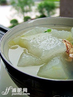 冬瓜性寒,味甘,清热渗湿,清痰排脓,利水消肿,有较好的减肥清身效用。冬瓜籽偏于利湿,冬瓜去皮利水,故用冬瓜边皮带籽,以求增加减肥效果。陈皮理气健脾燥湿。葱、姜通阳化饮利水。几品合用,有助于减肥轻身,增进活力,使人肥瘦适中,苗条且强壮有力。
