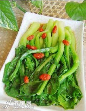材料:芥蓝半斤,枸杞适量,蒜蓉少许,香油适量,冰糖粉