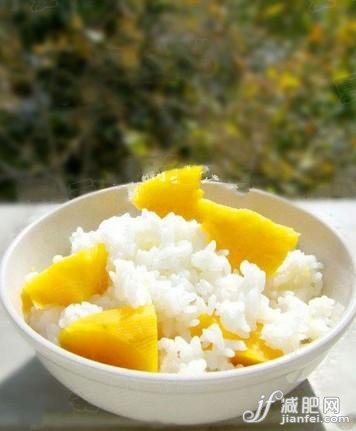 再加入适当的水,然后把米饭倒在红薯上,小火焖熟即可。