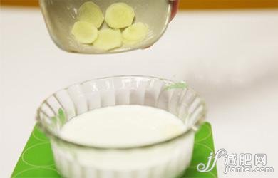 将生姜洗干净去皮,切成姜片。5~8片即可,放入加热的牛奶中。