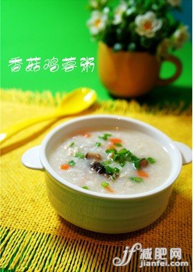 做法:先将水烧开,放入淘干净的大米与糯米煮粥,鸡脯肉洗干净切成蓉,加入植物油、盐以及清水搅匀,香菇泡发后切成丁,胡萝卜切成丁,姜切成丝;然后在熬粥30分钟左右加入香菇粒胡萝卜粒、姜丝搅拌均匀后转为中火继续熬,米开花后,加入腌好的鸡蓉继续煮至黏稠,加入盐、香油、鸡精、胡椒粉以及香葱碎即可。