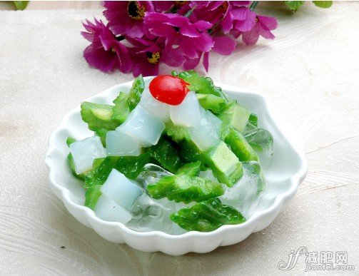 材料:芦荟50克,黄豆芽100克,黄瓜100克,青萝卜100克,豆腐(北)100克,青椒10克,醋15克,白砂糖15克,香油15克,盐3克。