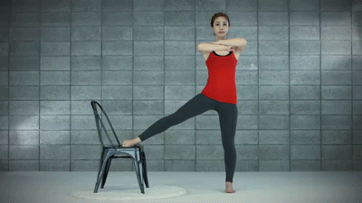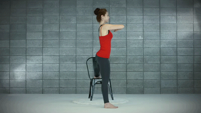 动作要领:上肢垂直于地面,右脚放在沙发或椅子上,匀速下蹲,完成10-12次后换边。如果难以平衡可以双手向前伸或者叉腰。