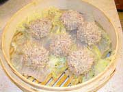 ②取平底容器,倒入江米面铺好,用漏勺盛馅蘸上水,倒入江米面中,滚动数次。取出后蘸水再滚动,这样连续多次地滚动,即成元宵。