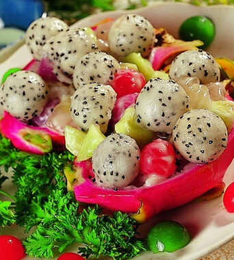 火龙果1个,乌梅8颗,青瓜块150克,糯米糕200克,蜂蜜适量。将火龙果去皮切块,乌梅去核,青瓜块和糯米糕放入火龙果容器中,加蜂蜜即可。
