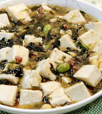材料:嫩豆腐200克,雪菜80克,香菜少许,调味料:糖1大匙,蒜末1茶匙,油1大匙。