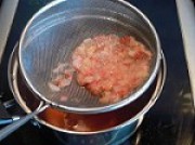 2.取一煮奶锅,倒入150ML水煮开,放入草莓丁煮成红汁,然后捞出草莓渣。