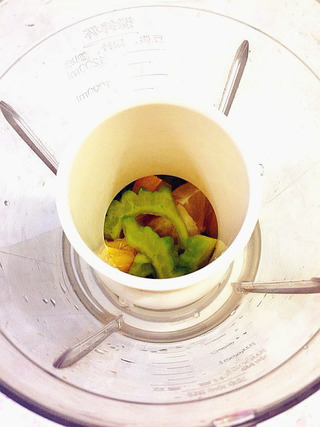 7、然后把所有切好的材料和约150ml的凉开水一起放入果汁机