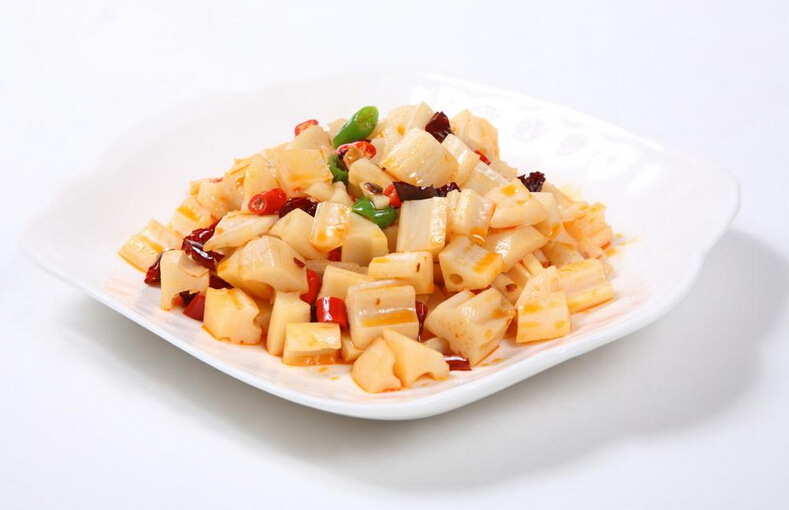 原料: 莲藕1节、莴笋半根、黄椒半个、干辣椒3个、花椒15粒、蒜2瓣、花生10粒