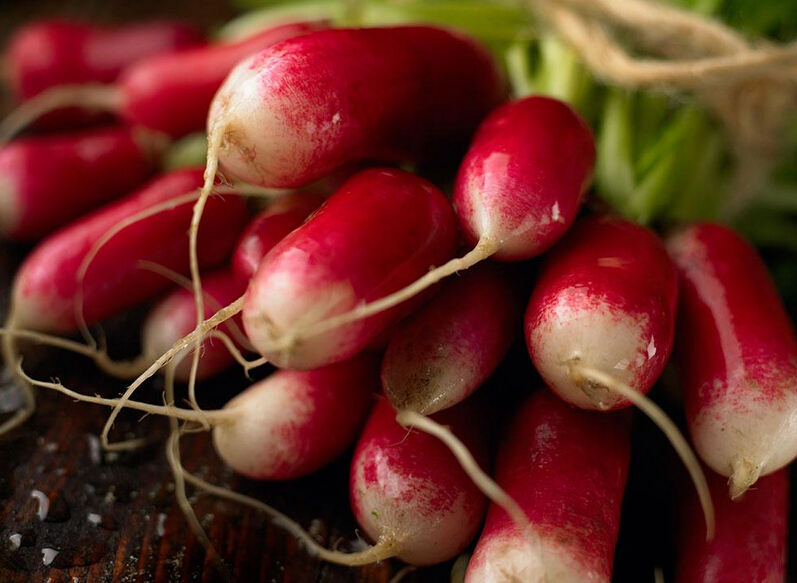 1)小萝卜摘掉缨子(绿色的叶子),清洗干净后切掉头尾,将头或尾部平放在案板上,刀垂直于萝卜,切成均匀的薄片,只切开萝卜的3/4即可,剩下的1/4不要切断。