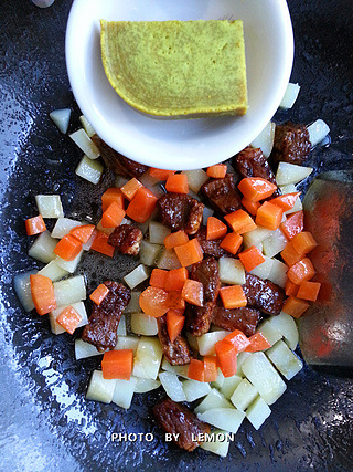 卖萌的柠檬7:煮咖喱牛肉饭需要选择大一点的锅,因为食材较多,堆满了煮开后会溢出来。锅小了也不好搅拌,咖喱必须搅拌均匀,不均匀就不好吃了。LEMON温馨提示哟~为了瘦身,请亲控制控制自己的嘴哟~