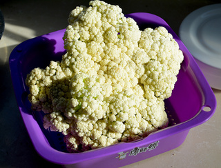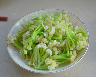 菜花一颗,掰开洗净,下开水烫一下(菜花不烫营养最好,可是现在的农药啊,哎!亲要是有机蔬菜还是别烫了)