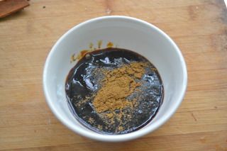 3、按照生抽两大勺,老抽一大勺,蚝油一大勺,唐一大勺,五香粉一小勺;盐和鸡精适量比例兑成碗汁
