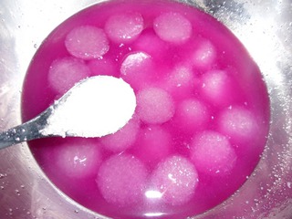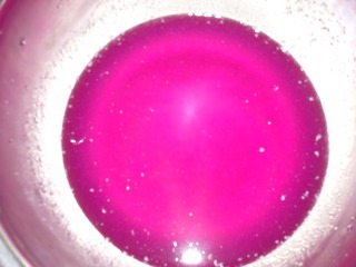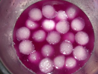 捞出放入紫甘蓝汁中浸泡,放冰箱冷藏半个小时以上