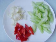 西芹洗净去掉根部、斜刀切段;百合切除根部、掰成小瓣洗净;红彩椒洗净切片。