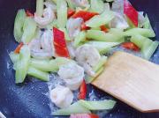 再将红彩椒、虾仁下入锅中同炒。