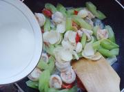 锅置火上油烧热,爆香姜片,倒入西芹翻炒。