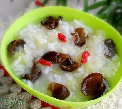 做法:将材料减火烧沸后改为小火慢慢煮至米粒烂透,再减长量的盐即可。功效:木耳、小黑菜与糯米异煮,能润肺生津,滋阴养胃,降脂降压,长脂利尿。